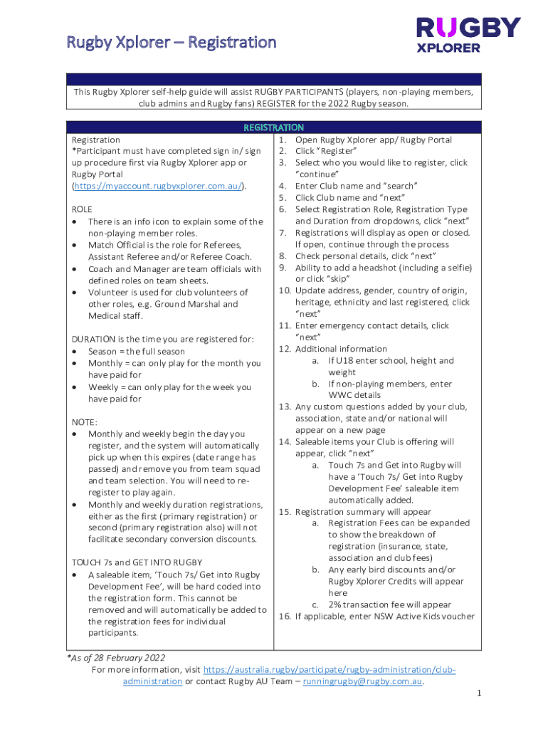 Rugby Explorer Registration This Rugby Explorer self-help guide will assist RUGBY PARTICIPANTS (players, nonpaying members, club admins and Rugby fans) REGISTER for the 2022 Rugby season. REGISTRATION