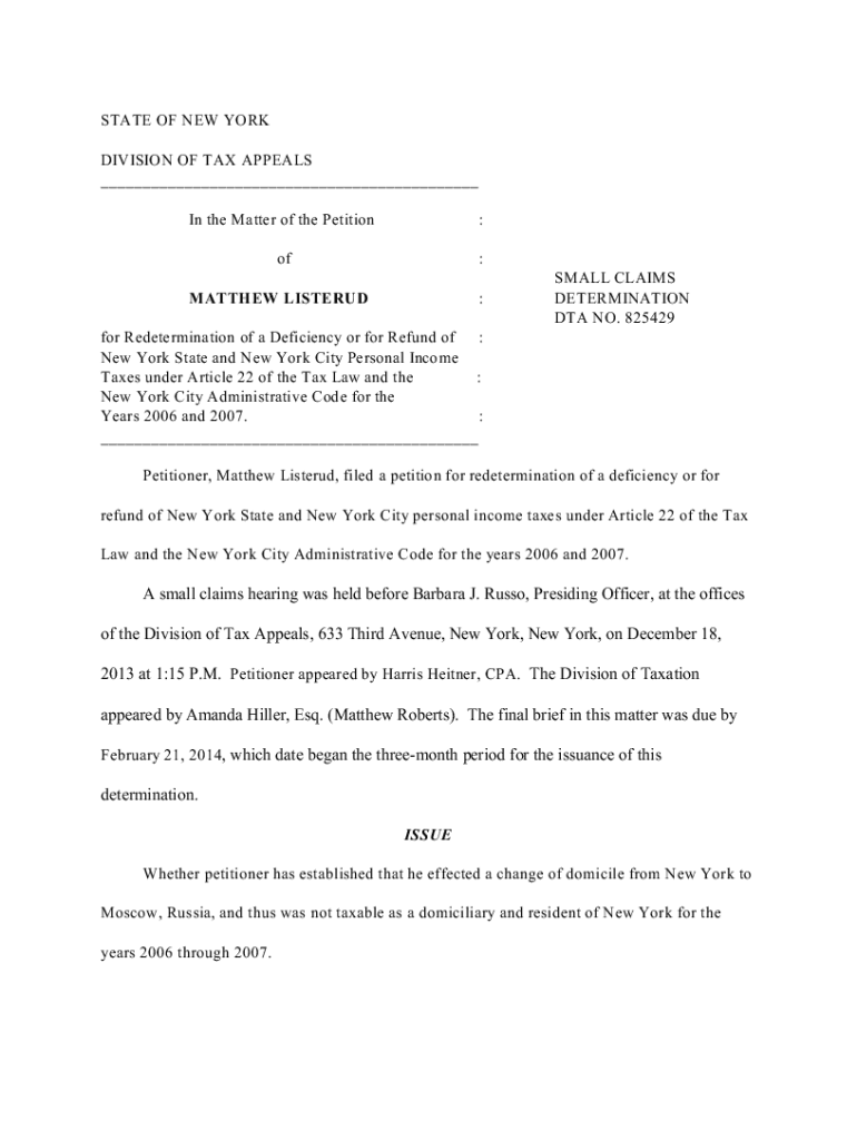 STATE OF NEW YORK DIVISION OF TAX APPEALS ___ In the Matter of the Petition:of: :MATTHEW LISTERUDSMALL CLAIMS DETERMINATION DTA NO. 825429for Redetermination of a Deficiency or for Refund of : New
