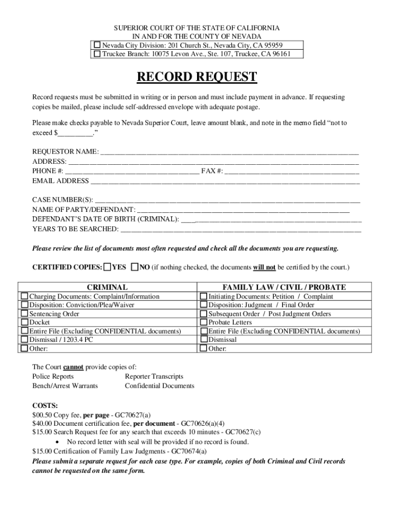 SUPERIOR COURT OF THE STATE OF CALIFORNIA IN AND FOR THE COUNTY OF NEVADA City Division: 201 Church St., Nevada City, CA 95959 Truckee Branch: 10075 Devon Ave., Ste. 107, Truckee, CA 96161RECORD REQUEST