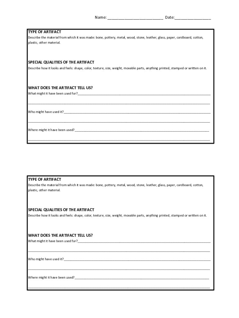 Name:___Date:___ TYPEOFARTIFACT Describethematerialfromwhichitwasmade:bone, pottery, metal, wood, stone, leather, glass, paper, cardboard, cotton, plastic, other material. SPECIALQUALITIESOFTHEARTIFACT