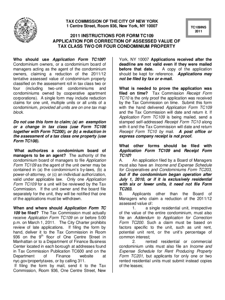 TAX COMMISSION OF THE CITY OF NEW YORK 1 Center Street, Room 936, New York, NY 10007TC109INS 20112011 INSTRUCTIONS FOR FORM TC109 APPLICATION FOR CORRECTION OF ASSESSED VALUE OF TAX CLASS TWO OR FOUR