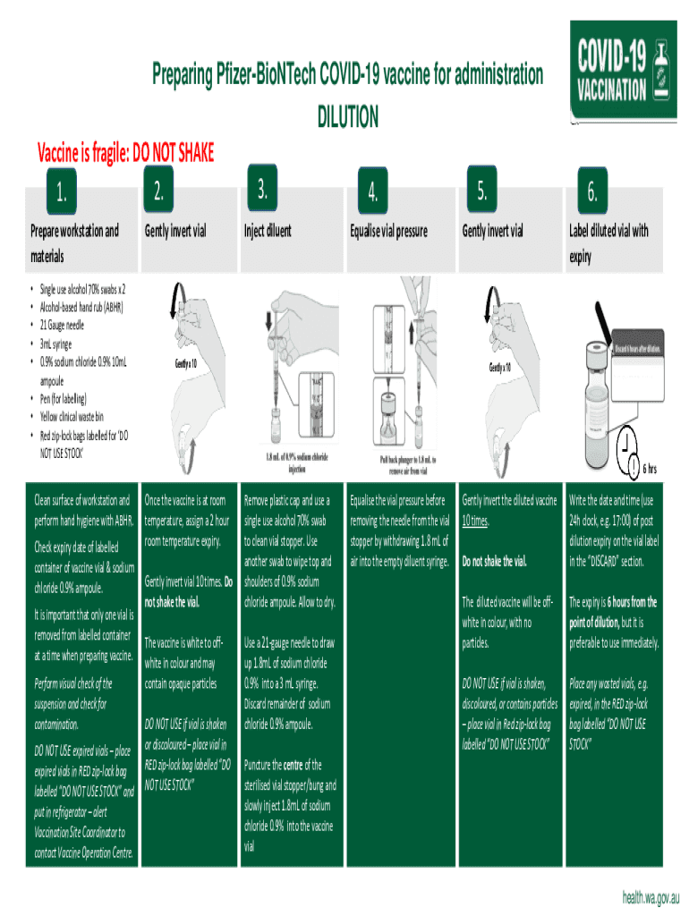 Preparing Pfizer BioNTech COVID-19 vaccine for administration DILUTION Vaccine is fragile: DO NOT SHAKE 3. 5. 2. 4. 1. Prepare workstation and materials. Gently invert vialInject diluentEqualise vial