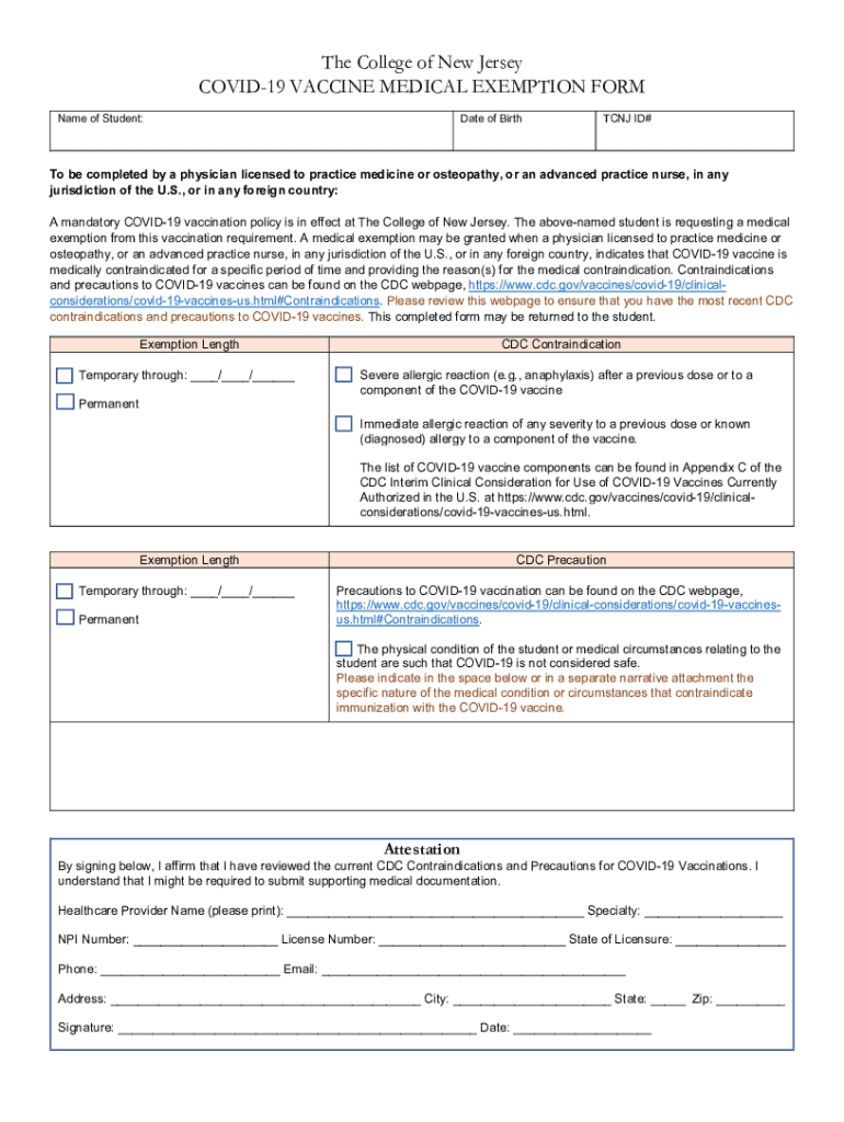 The College of New Jersey COVID-19 VACCINE MEDICAL EXEMPTION FORM Name of Student:Date of Birthing ID#To be completed by a physician licensed to practice medicine or osteopathy, or an advanced practice