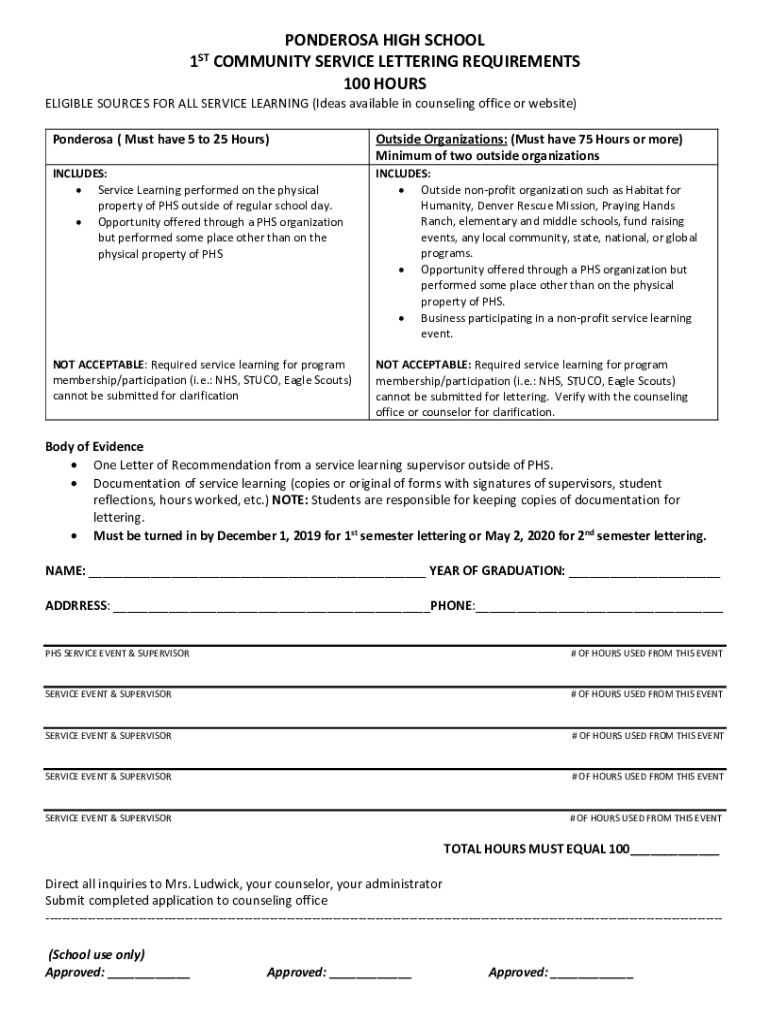 PONDEROSA HIGH SCHOOL 1 COMMUNITY SERVICE LETTERING REQUIREMENTS 100 HOURS ELIGIBLE SOURCES FOR ALL SERVICE LEARNING (Ideas available in counseling office or website) Ponderosa (Must have 5 to 25