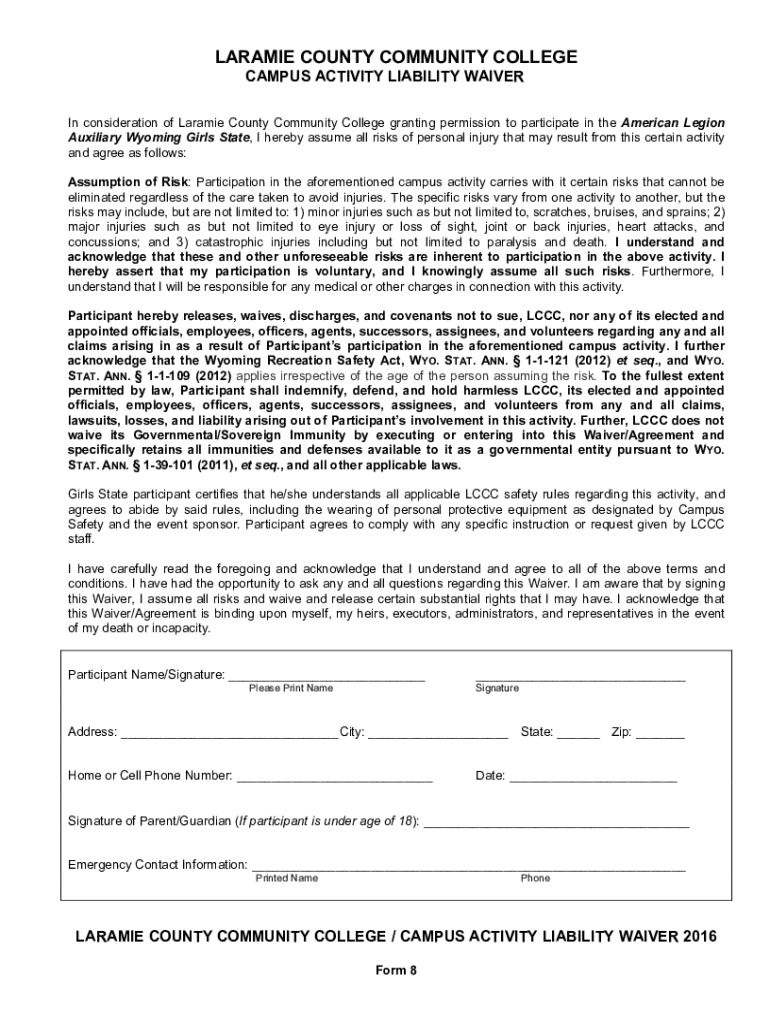 LARAMIE COUNTY COMMUNITY COLLEGE CAMPUS ACTIVITY LIABILITY WAIVER In consideration of Laramie County Community College granting permission to participate in the American Legion Auxiliary Wyoming Girls
