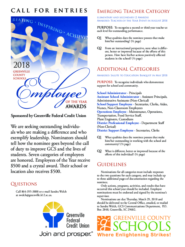 Call for entriesEmerging Teacher Category elementary and secondary (2 Awards) Awarded: Teacher of the Year Event in August 2018PURPOSE: To recognize a second or third year teacher at each level for