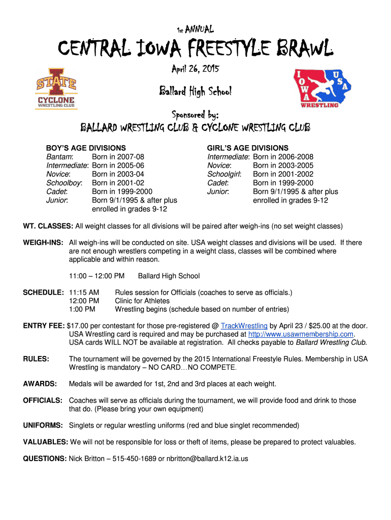 1st ANNUAL CENTRAL IOWA FREESTYLE BRAWL April 26, 2015, Ballard High School Sponsored by: BALLARD WRESTLING CLUB & CYCLONE WRESTLING CLUB BOYS AGE DIVISIONS Bantam: Born in 200708 Intermediate: Born