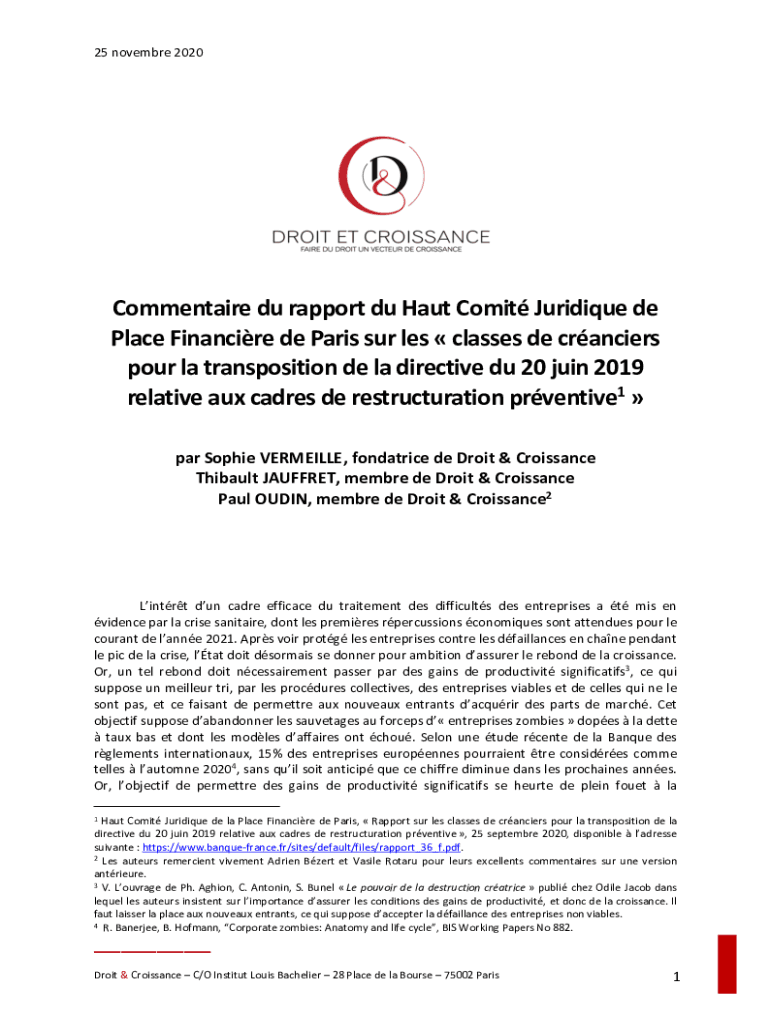 25 November 2020Commentaire Du rapport Du Hat Comic Critique DE Place Financier de Paris SUR LES classes DE cancers pour la transposition DE la directive Du 20 join 2019 relative aux cadres DE structuration