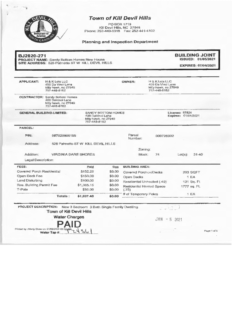 . \”\'Town of Kill Devil Hills PO BOX 1719 Kill Devil Hills, NC 27948 Phone: 2524495318 Fax: 252441 4102Planning and Inspection DepartmentBUILDING JOINTBJ2020271ISSUED: 01/05/2021PROJECT NAME: Sandy