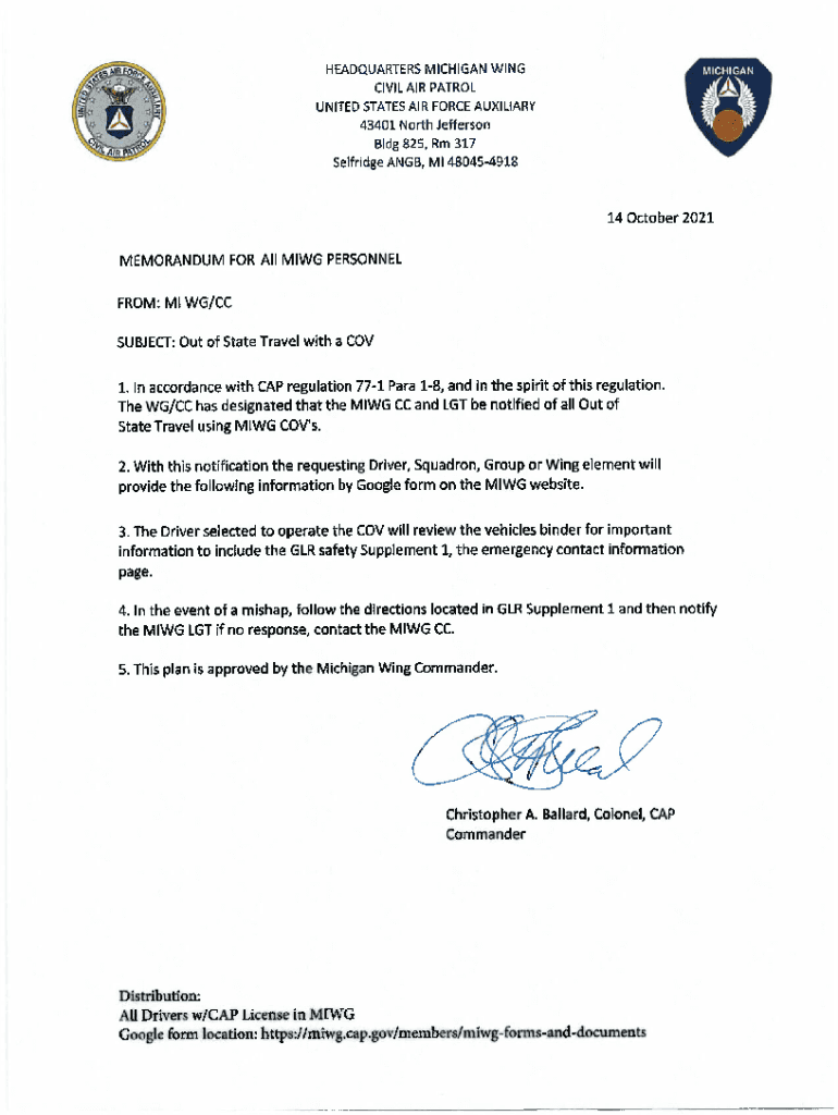 HEADQUARTERS MICHIGAN WING CIVIL AIR PATROL UNITED STATES AIR FORCE AUXILIARY 43401 North Jefferson Bldg 825, Rm 317 Selfridge AGB, M148045491814 October 2021 MEMORANDUM FOR All MING PERSONNEL FROM: