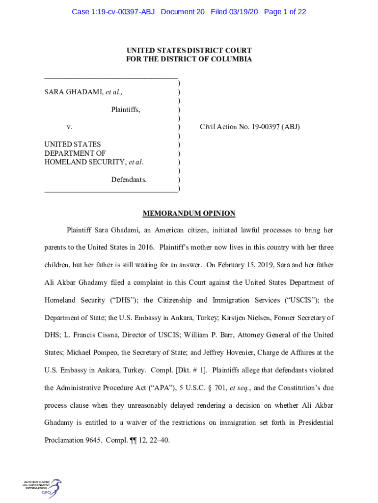Case 1:19cv00397ABJ Document 20 Filed 03/19/20-Page 1 of 22UNITED STATES DISTRICT COURT FOR THE DISTRICT OF COLUMBIA ___) SARA THALAMI, et al.,) ) Plaintiffs,) ) v.) ) UNITED STATES) DEPARTMENT OF)