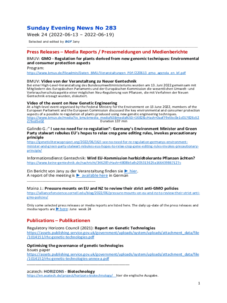Sunday Evening News No 283 Week 24 (20220613 20220619) Selected and edited by BGF Any ___Press Releases Media Reports / Pressemeldungen UND Medienberichte BMU: GMO Regulation for plants derived from