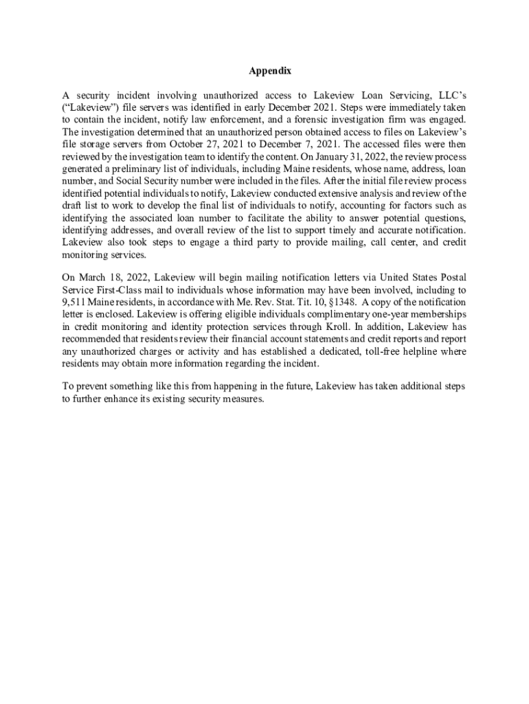 Appendix A security incident involving unauthorized access to Lake view Loan Servicing, LCS (Lake view) file servers was identified in early December 2021. Steps were immediately taken to contain