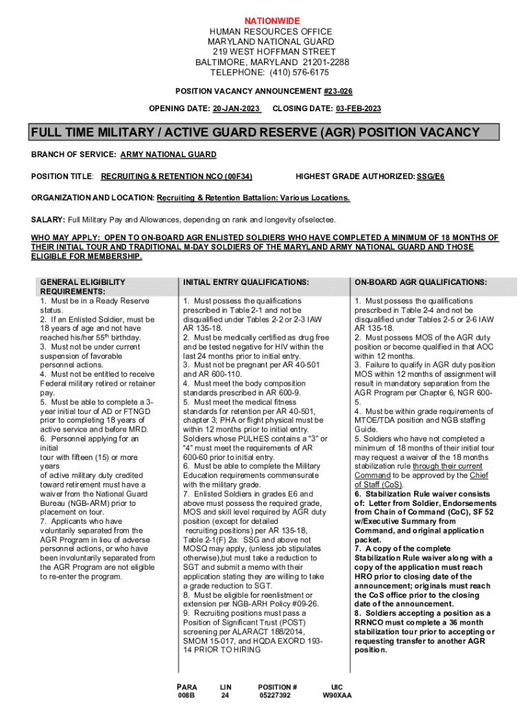 NATIONWIDE HUMAN RESOURCES OFFICE MARYLAND NATIONAL GUARD 219 WEST HOFFMAN STREET BALTIMORE, MARYLAND 212012288 TELEPHONE: (410) 5766175 POSITION VACANCY ANNOUNCEMENT #23026 OPENING DATE: 20JAN2023CLOSING