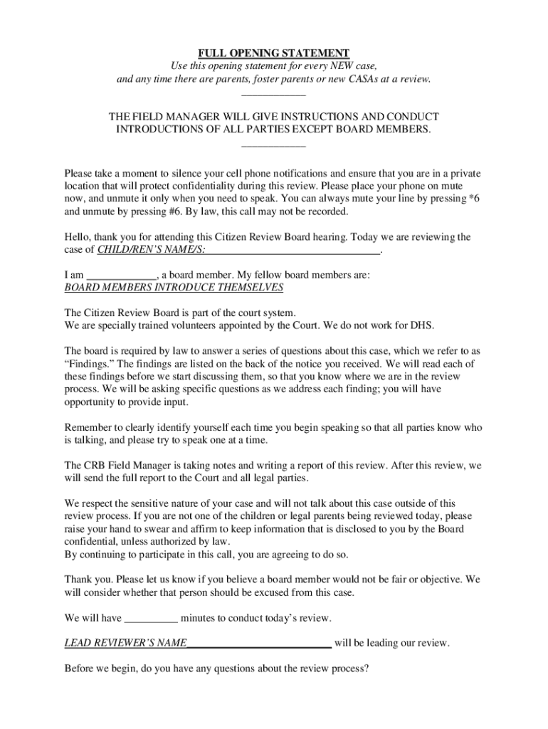 FULL OPENING STATEMENT Use this opening statement for every NEW case, and any time there are parents, foster parents or new Cases at a review. ___ THE FIELD MANAGER WILL GIVE INSTRUCTIONS AND CONDUCT