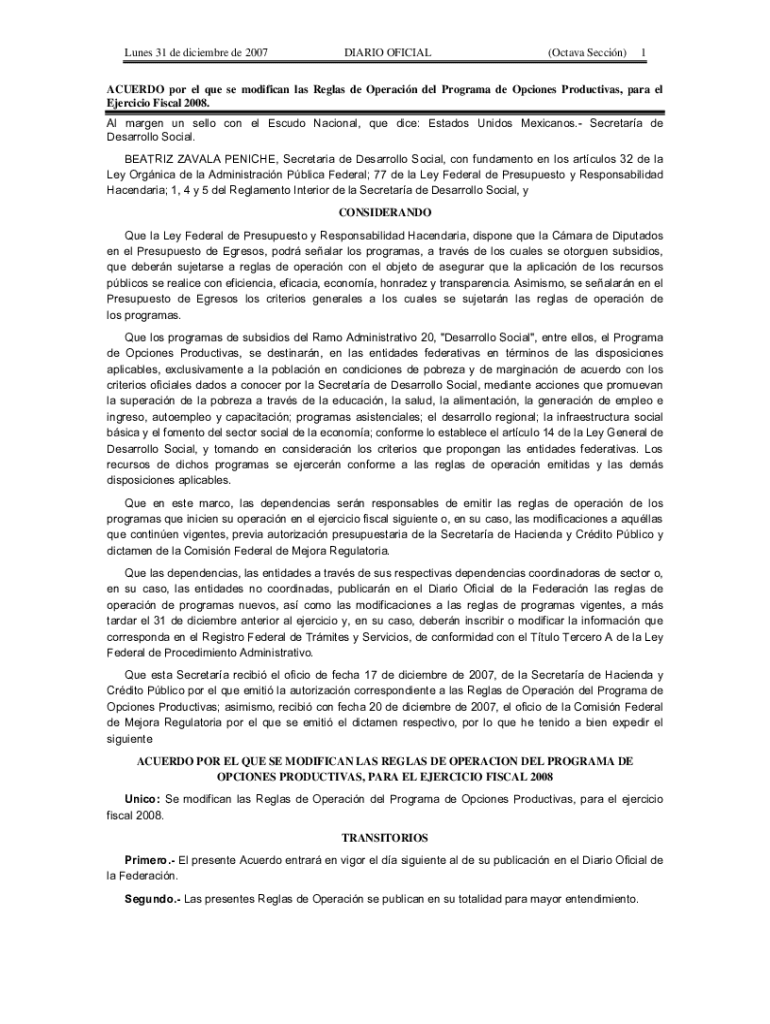 Lines 31 de December de 2007DIARIO OFFICIAL(Octave Section)1ACUERDO POR el Que SE modified leis Regular de Operacin Del Program de Opciones Productions, para el