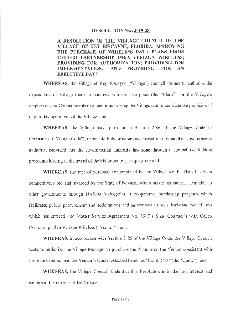 RESOLUTION NO. 2OI928A RESOLUTION OF THE VILLAGE COUNCIL OF THE VILLAGE OF KEY BISCAYNE, FLORIDA APPROVING THE PURCHASE OF WIRELESS DATA PLANS FROM CELLO PARTNERSHIP Debit VERIZON WIRELESS; PROVIDING