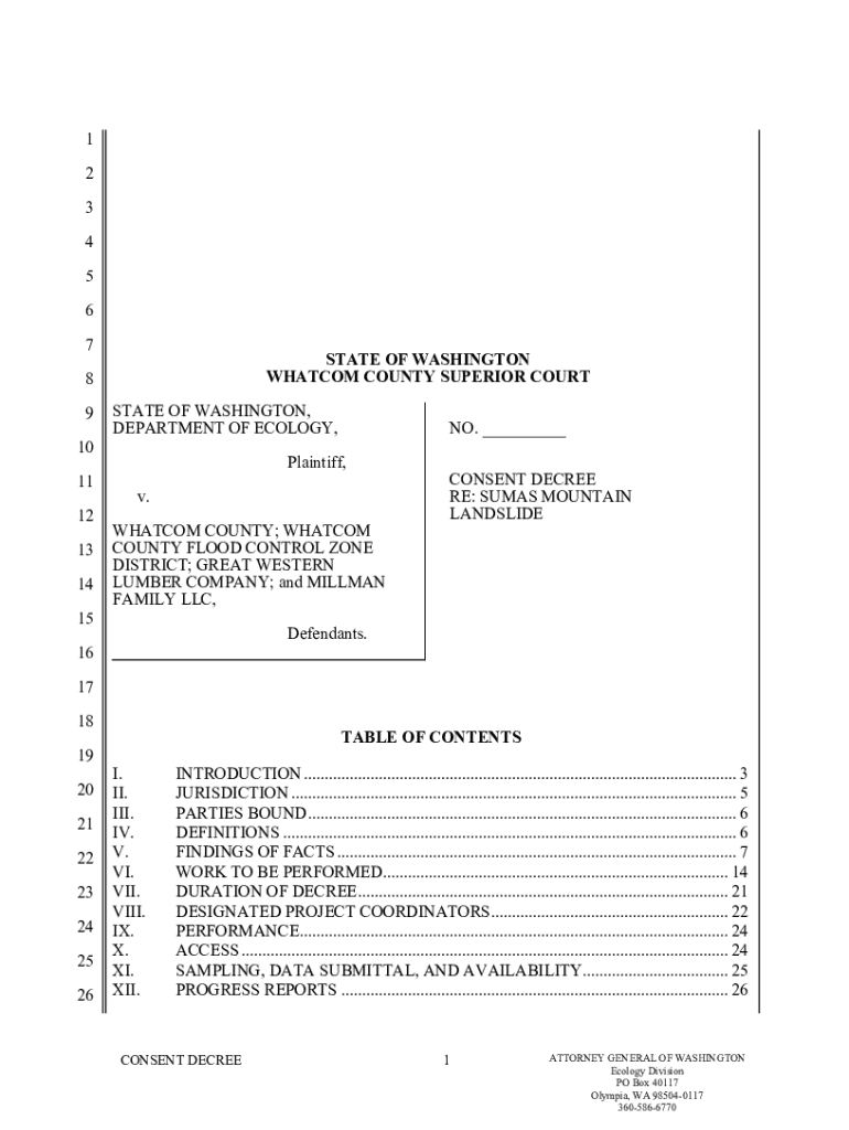 1 2 3 4 5 6 7STATE OF WASHINGTON WHATCOM COUNTY SUPERIOR COURT8 9STATE OF WASHINGTON, DEPARTMENT OF ECOLOGY,10 11 12 13 14NO. ___Plaintiff, CONSENT DECREE RE: SUMS MOUNTAIN Landslide. WHATCOM COUNTY;