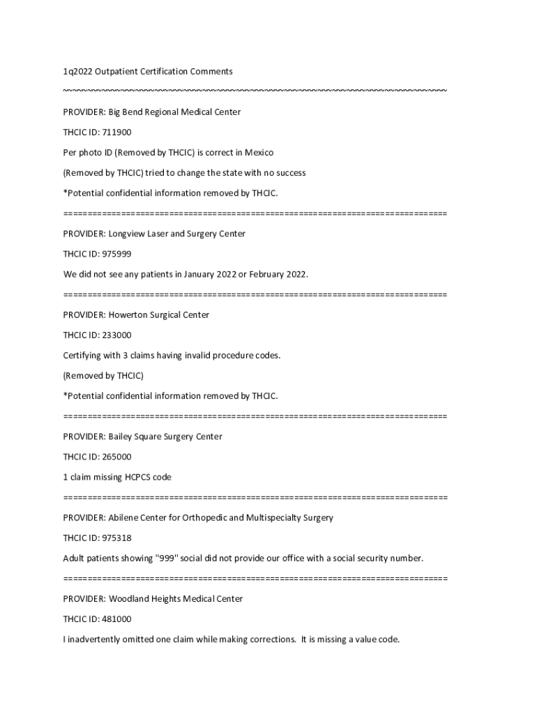 1q2022 Outpatient Certification Comments PROVIDER: Big Bend Regional Medical Center TH CIC ID: 711900 Per photo ID (Removed by TH CIC) is correct in Mexico (Removed by TH CIC) tried to change the