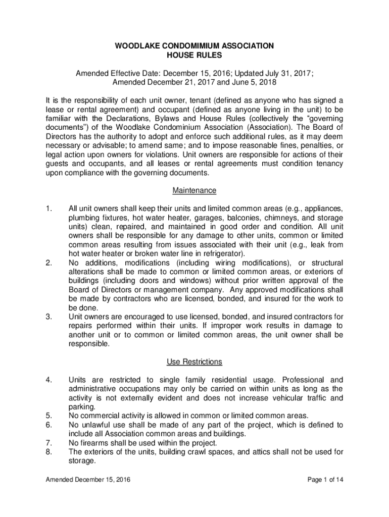 WOODLAND CONDOMINIUM ASSOCIATION HOUSE RULES Amended Effective Date: December 15, 2016; Updated July 31, 2017; Amended December 21, 2017, and June 5, 2018, It is the responsibility of each unit owner,