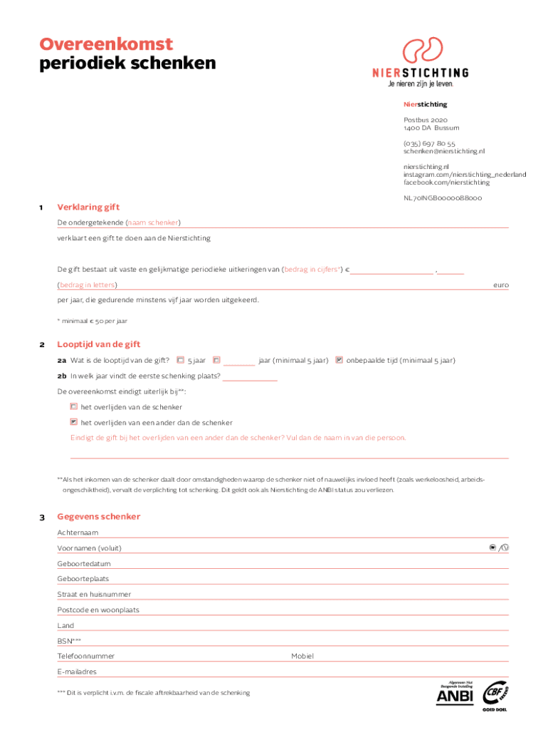 Individuals or organizations making periodic donations in the Netherlands are required to file NBS overeenkomst periodiek schenken.