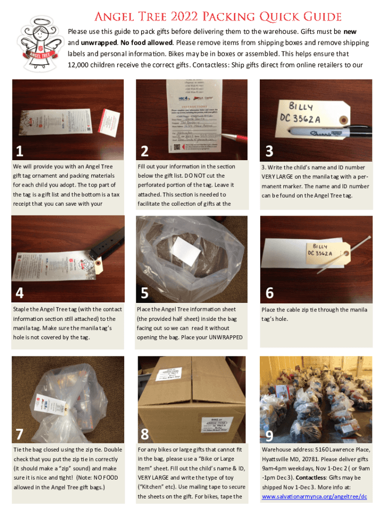 Please use this guide to pack gifts before delivering them to the warehouse. Gifts must be new and unwrapped. No food allowed. Please remove items from shipping boxes and remove shipping labels and