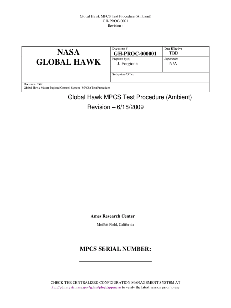 Global Hawk PCs Test Procedure (Ambient) GHPROC0001 Revision NASA GLOBAL HAWKDocument #GHPROC000001 Prepared by(s)J. ForgioneDate Effective TBD Supersedes/Subsystem/Office Document Title Global Hawk