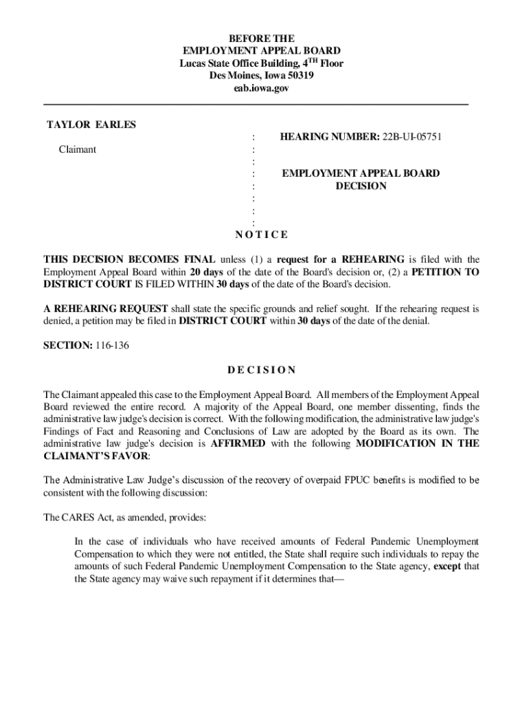 BEFORE THE EMPLOYMENT APPEAL BOARD Lucas State Office Building, 4TH Floor Des Moines, Iowa 50319 eat.Iowa.gov ___ TAYLOR EAGLES Claimant: HEARING NUMBER: 22BUI05751 : : : EMPLOYMENT APPEAL BOARD :