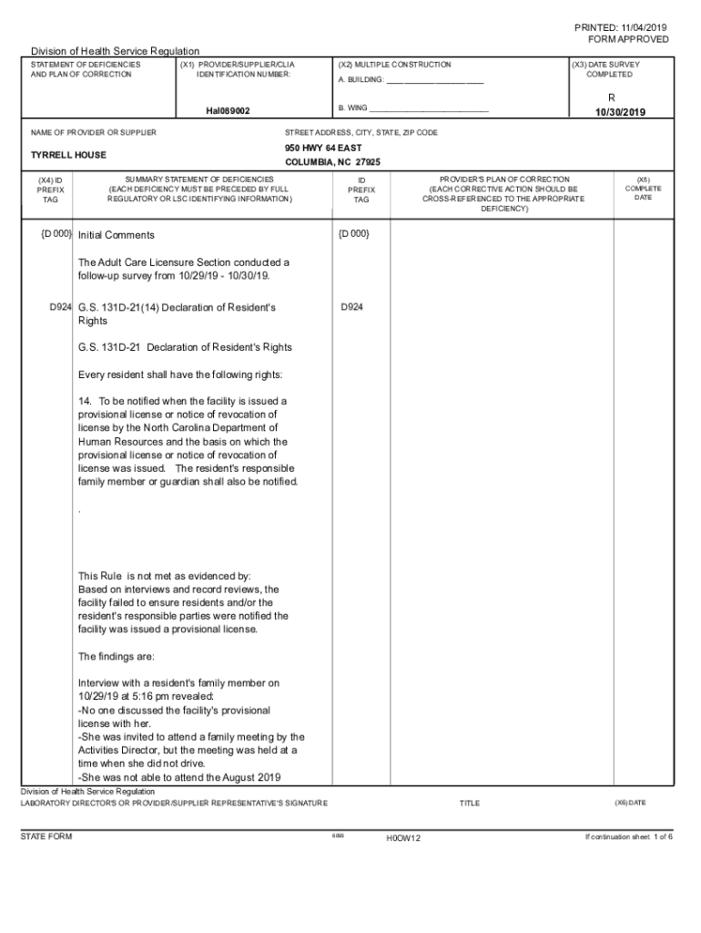 PRINTED: 11/04/2019 FORM APPROVEDDivision of Health Service Regulation STATEMENT OF DEFICIENCIES AND PLAN OF CORRECTION(X1) PROVIDER/SUPPLIER/CIA IDENTIFICATION NUMBER:A. BUILDING: ___R 10/30/2019STREET