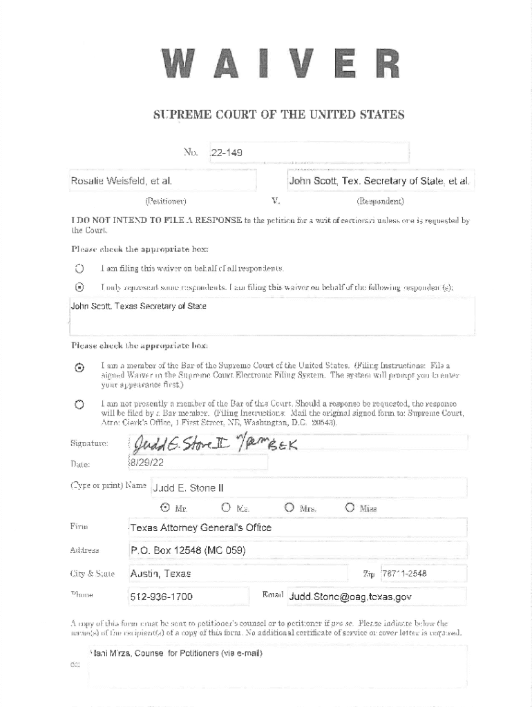 WAIVER SUPREME COURT OF THE UNITED STATES No.22149Rosalie Washed, et al. John Scott, Tex. Secretary of State, et al. V.(Petitioner)(Respondent)I DO NOT INTEND TO FILE A RESPONSE to the petition for