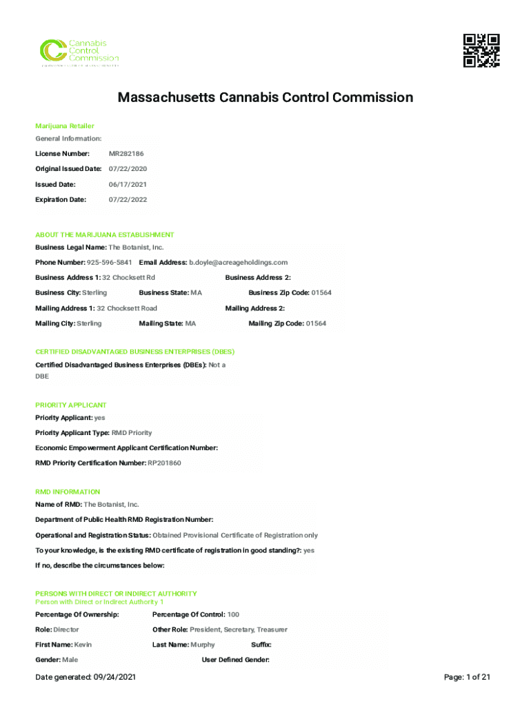 Massachusetts Cannabis Control Commission Marijuana Retailer General Information: License Number:MR282186Original Issued Date: 07/22/2020 Issued Date:06/17/2021Expiration Date:07/22/2022ABOUT THE