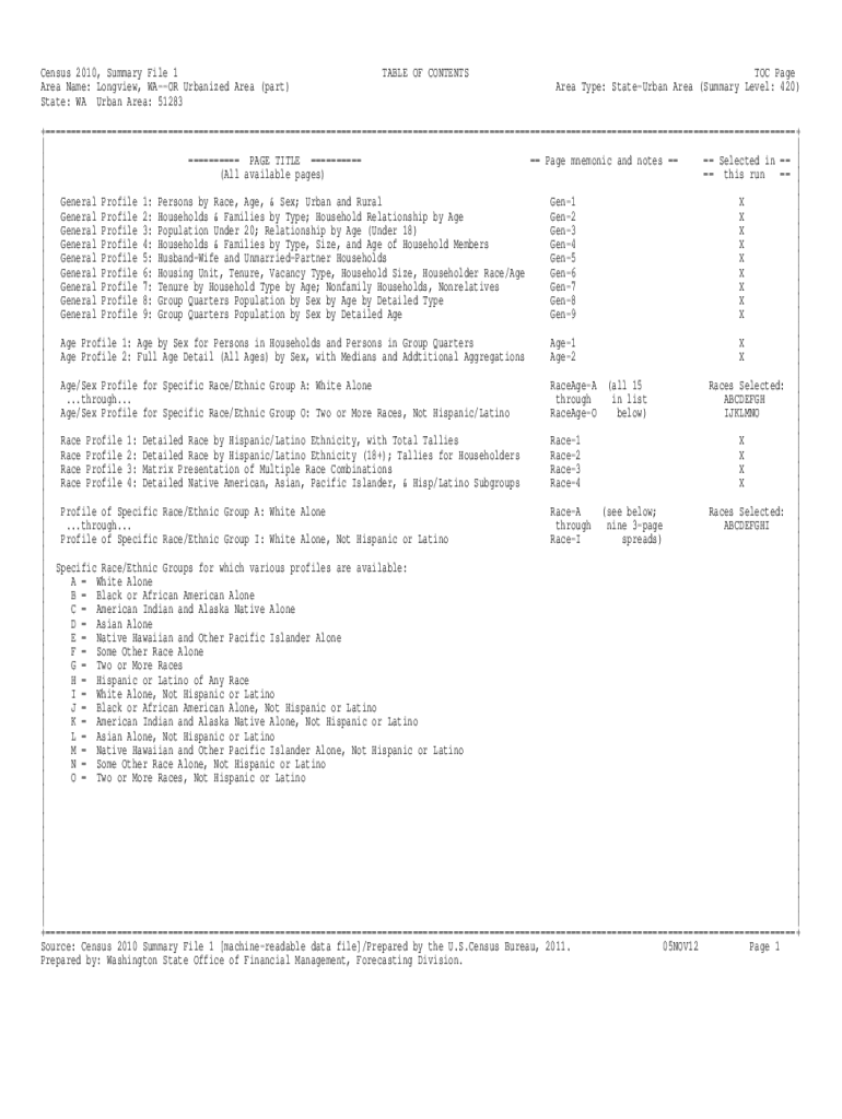 Census 2010, Summary File 1 Area Name: Longview, WAR Urbanized Area (part) State: WA Urban Area: 51283TABLE OF CONTENTS Page Area Type: State Urban Area (Summary Level: 420)++ | | | PAGE TITLE Page