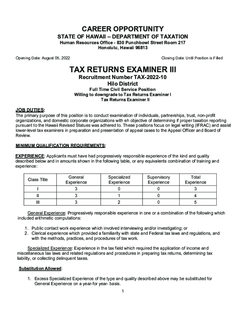 CAREER OpportunitySpace OF HAWAII DEPARTMENT OF TAXATION Human Resources Office 830 Punch bowl Street Room 217 Honolulu, Hawaii 96813Opening Date: August 05, 2022Closing Date: Until Position is Filled
