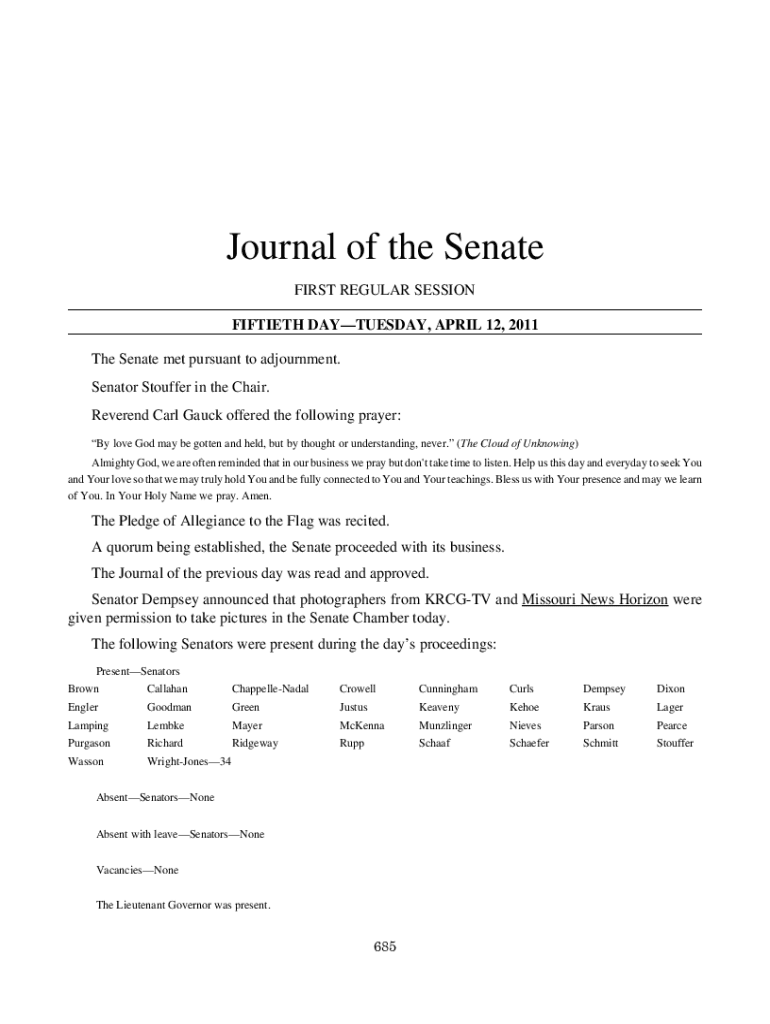 Journal of the Senate FIRST REGULAR SESSION FIFTIETH TUESDAY, APRIL 12, 2011, The Senate met pursuant to adjournment. Senator Stouffer in the Chair. Reverend Carl Back offered the following prayer:
