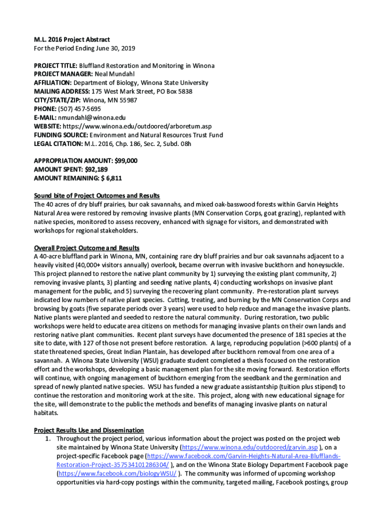 M.L. 2016 Project Abstract For the Period Ending June 30, 2019, PROJECT TITLE: Bluff land Restoration and Monitoring in Winona PROJECT MANAGER: Neal Mundane AFFILIATION: Department of Biology, Winona