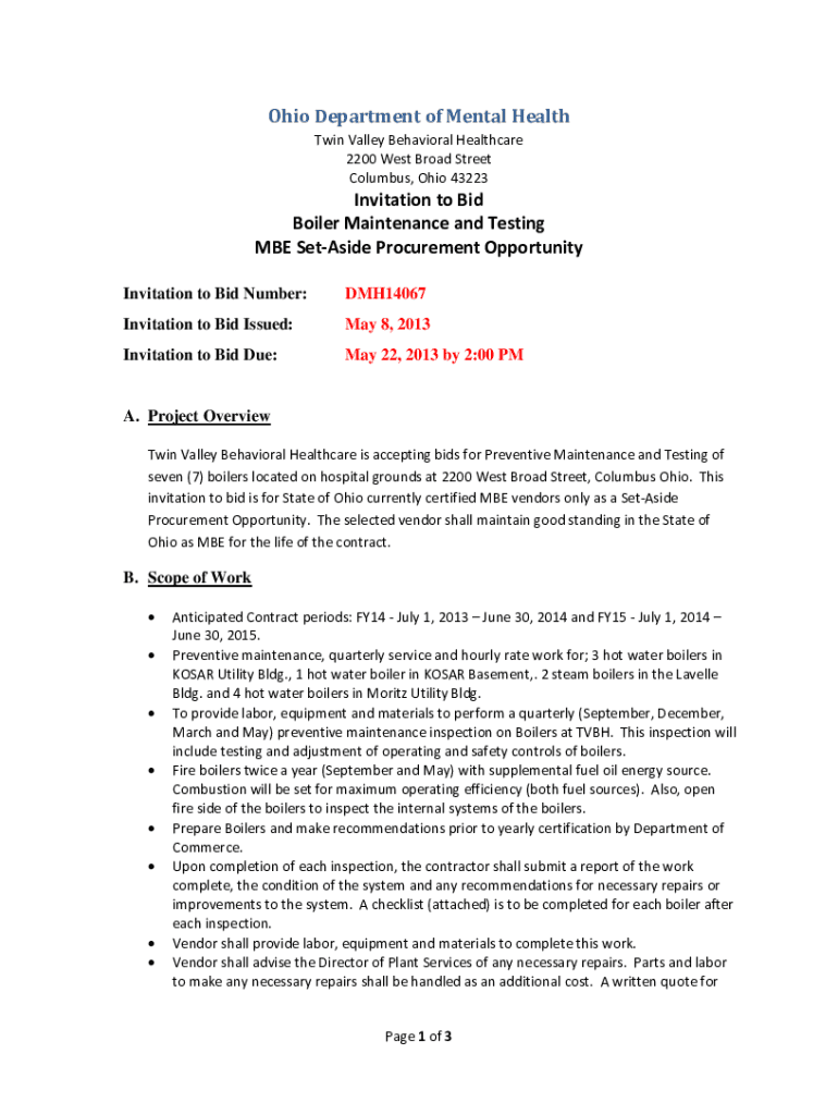 Ohio Department of Mental Health Twin Valley Behavioral Healthcare 2200 West Broad Street Columbus, Ohio 43223Invitation to Bid Boiler Maintenance and Testing BE Seaside Procurement Opportunity Invitation