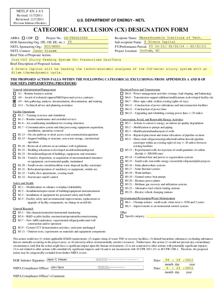 NET F 451.11/1 Revised: 11/7/2011 Reviewed: 11/7/2011 (Previous Editions Obsolete)U.S. DEPARTMENT OF ENERGY NETLCATEGORICAL EXCLUSION (CX) DESIGNATION FORM AREA CDP Project No.: DEFE0012500 Recipient