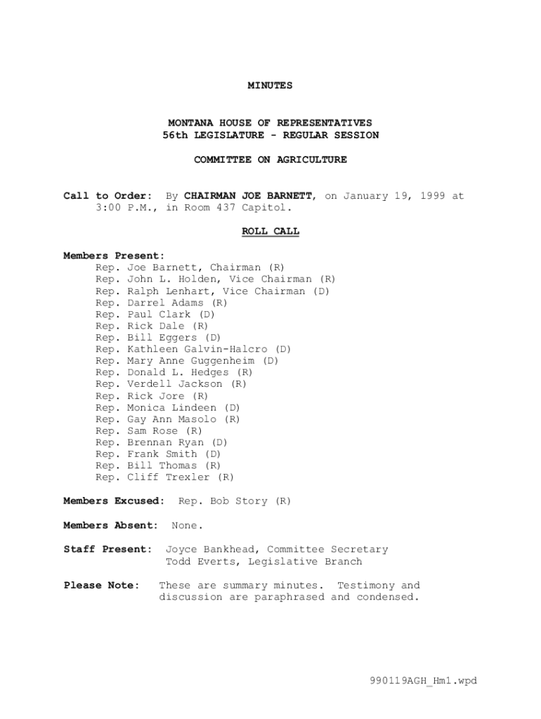 MINUTESMONTANA HOUSE OF REPRESENTATIVES 56th LEGISLATURE REGULAR SESSION COMMITTEE ON AGRICULTURE Call to Order: By CHAIRMAN JOE BARNETT, on January 19, 1999, at 3:00 P.M., in Room 437 Capitol. ROLL