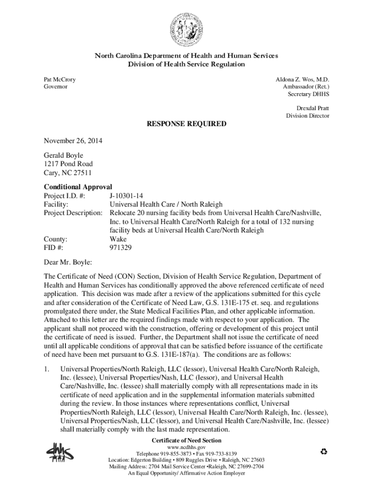 North Carolina Department of Health and Human Services Division of Health Service Regulation Pat McCrory GovernorAldona Z. Was, M.D. Ambassador (RET.) Secretary HHS DREAL Pratt Division DirectorRESPONSE