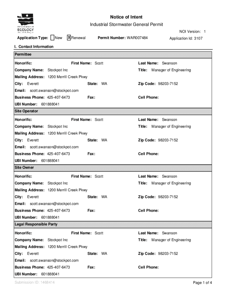 Notice of Intent Industrial Stormwater General Permit NOI Version: 1 Application Type:New RenewalPermit Number: WAR007484Application I'd: 3107I. Contact Information Permitted Honorific:First Name: