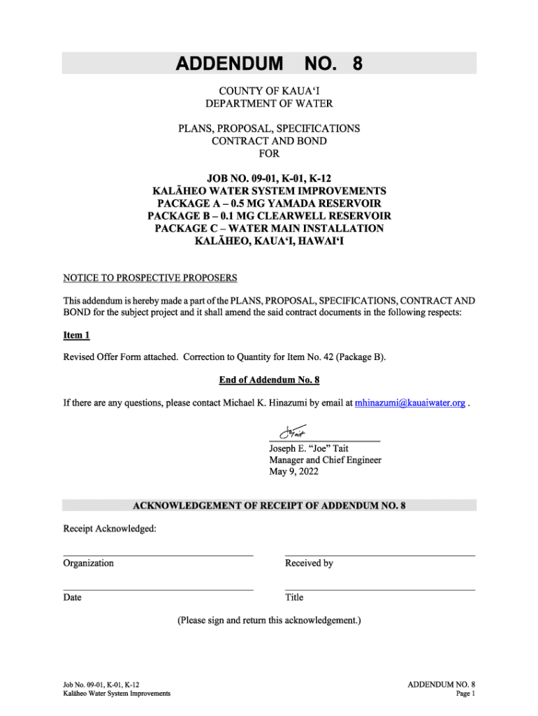 Contractor___ OFFER For DEPARTMENT OF WATER, COUNTY OF KAUAI, HUE, KAUAI, HAWAII ___ 20___ Chief Procurement Officer Department of Water County of Kauai 4398 PUA Like Street Hue, Hawaii 96766 Dear