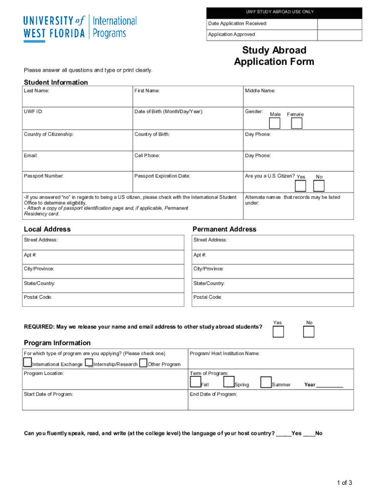 The study abroad application form is a document that students need to fill out in order to apply for studying abroad at a university or institution in another country.