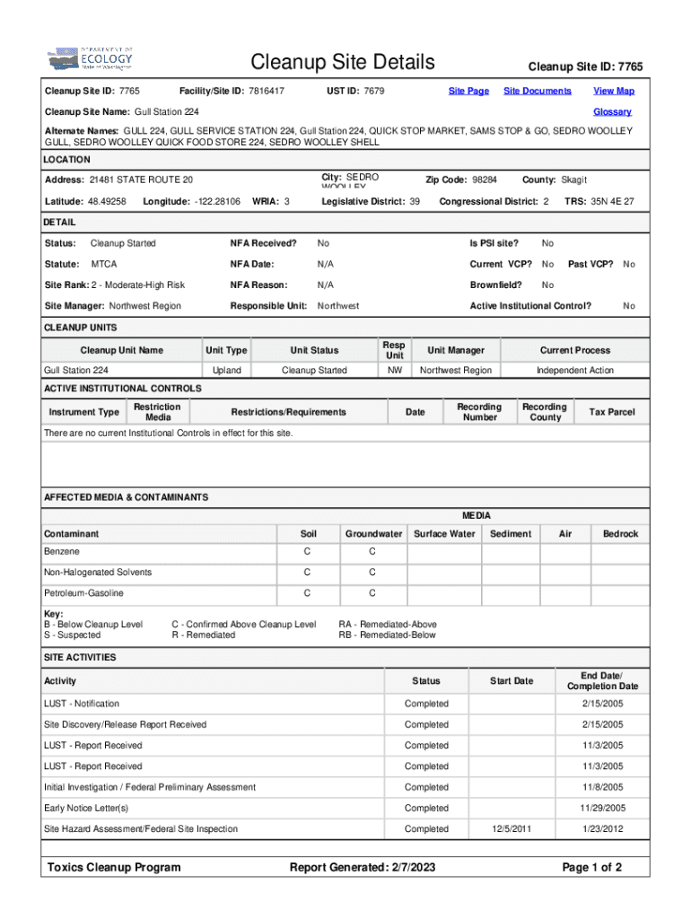 Cleanup Site ID: 7765Facility/Site ID: 7816417Cleanup Site ID: 7765UST ID: 7679Site Page Site Documentaries Cleanup Site Name: Gull Station 224GlossaryAlternate Names: GULL 224,