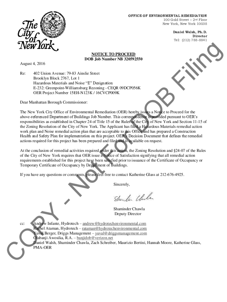 OFFICE OF ENVIRONMENTAL REMEDIATION 100 Gold Street 2nd Floor New York, New York 10038gDaniel Walsh, Ph.D. Director Tel: (212) 7888841linNOTICE TO PROCEED DOB Job Number NB 320592550 August 4, 2016Fi402