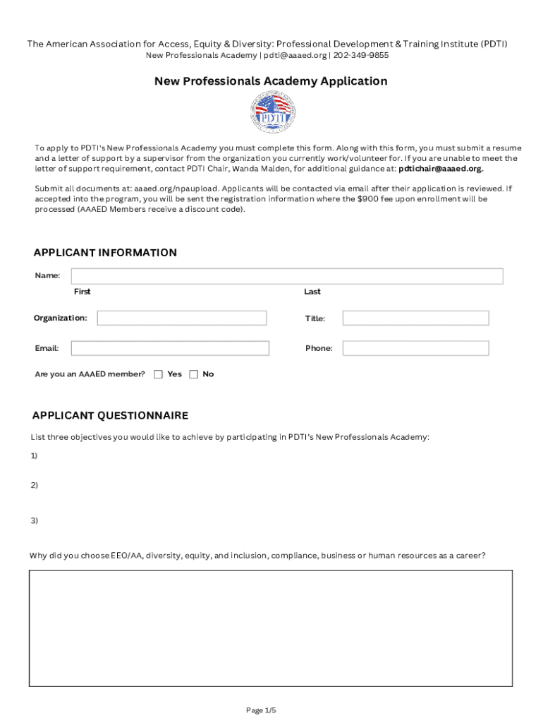 The American Association for Access, Equity & Diversity: Professional Development & Training Institute (DTI) New Professionals Academy | pdti@aaaed.org | 2023499855New Professionals Academy Application