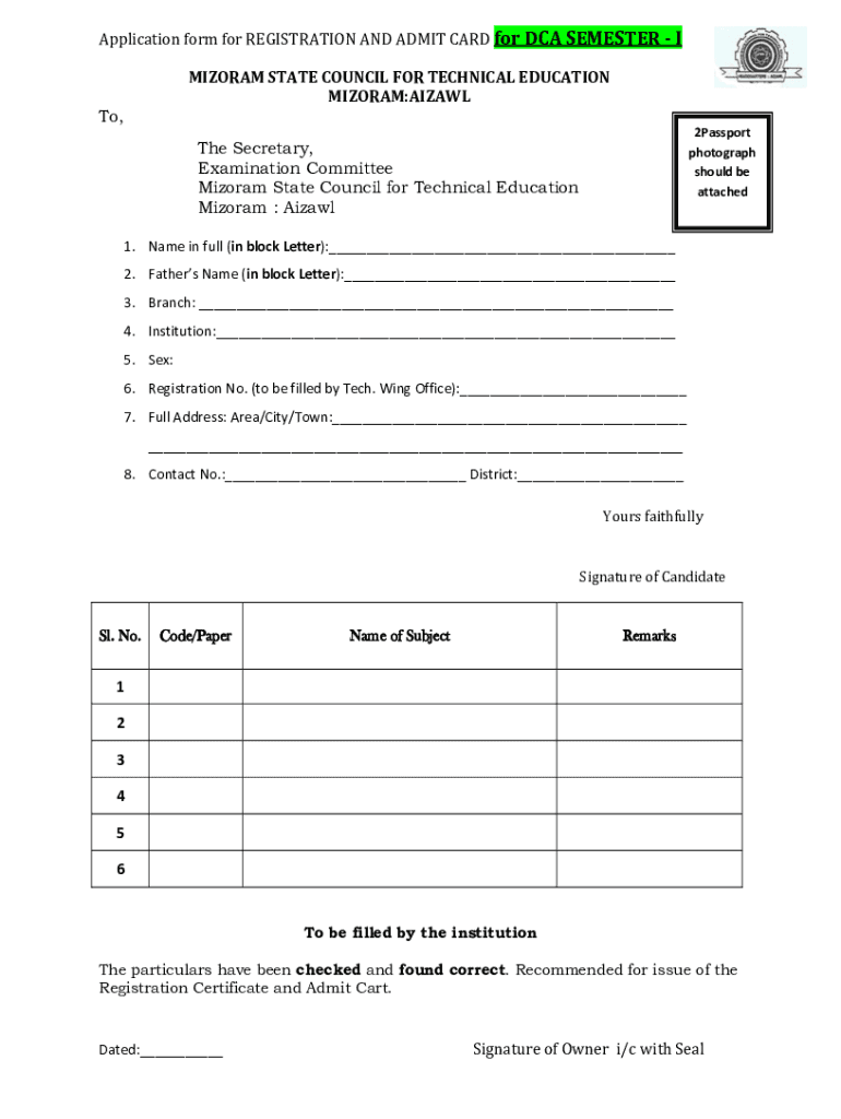Application form for REGISTRATION AND ADMIT CARD for DCA SEMESTER I MIZORAM STATE COUNCIL FOR TECHNICAL EDUCATION MIZORAM:Aigaleo,2Passport photograph should be attached Secretary, Examination Committee