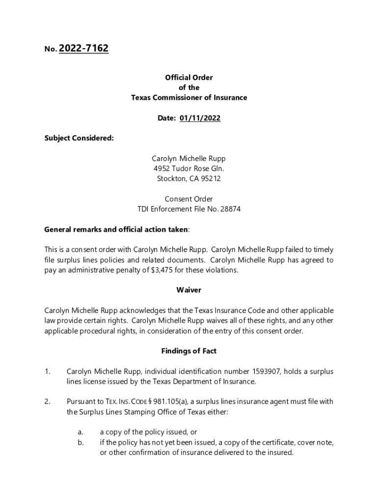 No. 20227162 Official Order of the Texas Commissioner of Insurance Date: 01/11/2022 Subject Considered: Carolyn Michelle Rump 4952 Tudor Rose GLN. Stockton, CA 95212 Consent Order TDI Enforcement