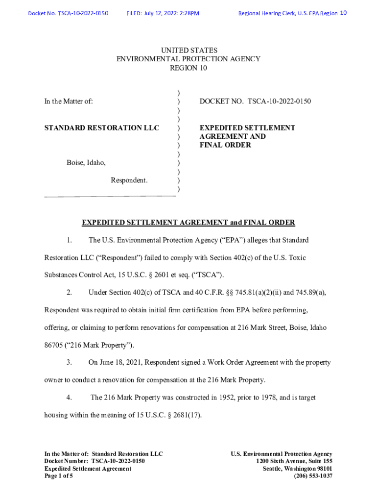 Docket No. TSCA1020220150Regional Hearing Clerk, U.S. EPA Region 10FILED: July 12, 2022: 2:28PMUNITED STATES ENVIRONMENTAL PROTECTION AGENCY REGION 10In the Matter of: STANDARD RESTORATION LLC Boise,