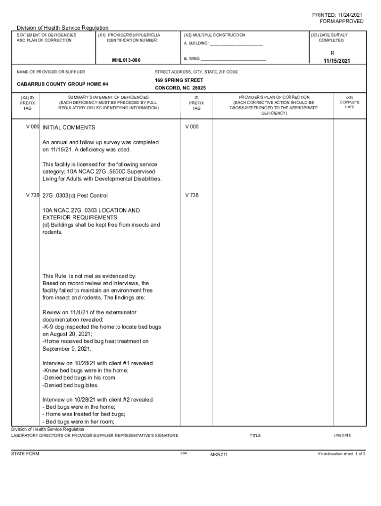 PRINTED: 11/24/2021 FORM APPROVEDDivision of Health Service Regulation STATEMENT OF DEFICIENCIES AND PLAN OF CORRECTION(X1) PROVIDER/SUPPLIER/CIA IDENTIFICATION NUMBER:CABARETS COUNTY GROUP HOME #4