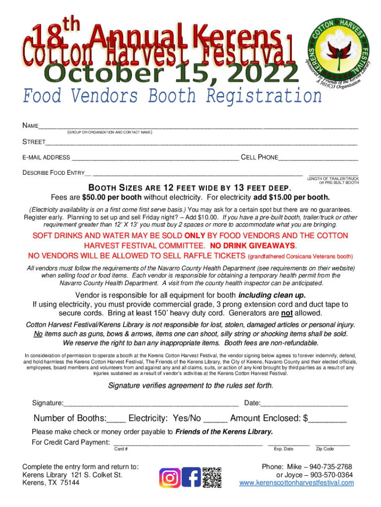 NAME___ (GROUP OR ORGANIZATION AND CONTACT NAME)STREET___ EMAIL ADDRESS ___CELL PHONE___DESCRIBE FOOD ENTRY__ ___B BOTH S IZESARE12FEET WIDE BY13FEET DEEP.___ LENGTH OF TRAILER/TRUCK OR PREBUILT Bootees